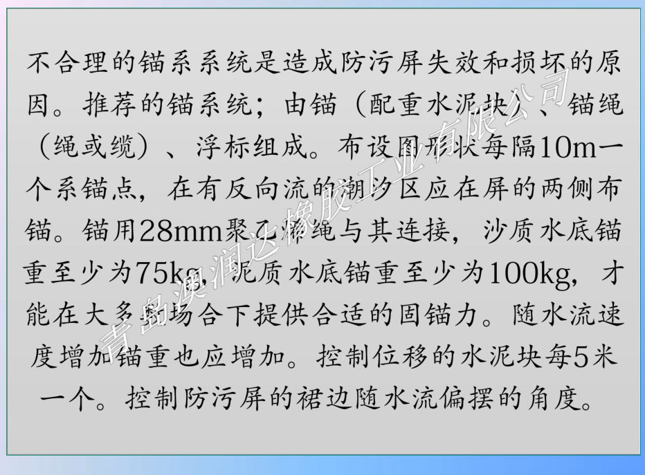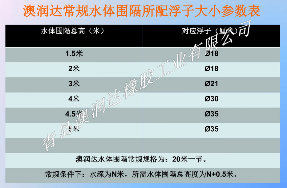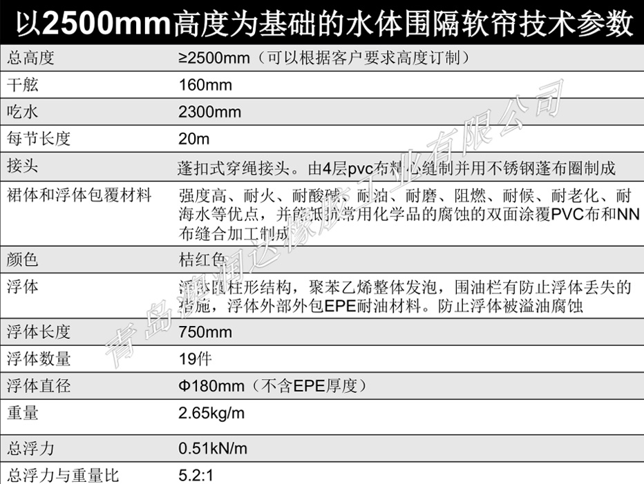 3.水域防浊帘每节长度、裙体高度、浮体大小,根据用户实际水域的深度、流速、波高、风力等实际条件确定。